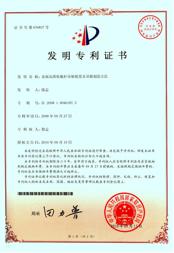 金屬高塔低桅桿倒裝法獲國家發(fā)明專(zhuān)利