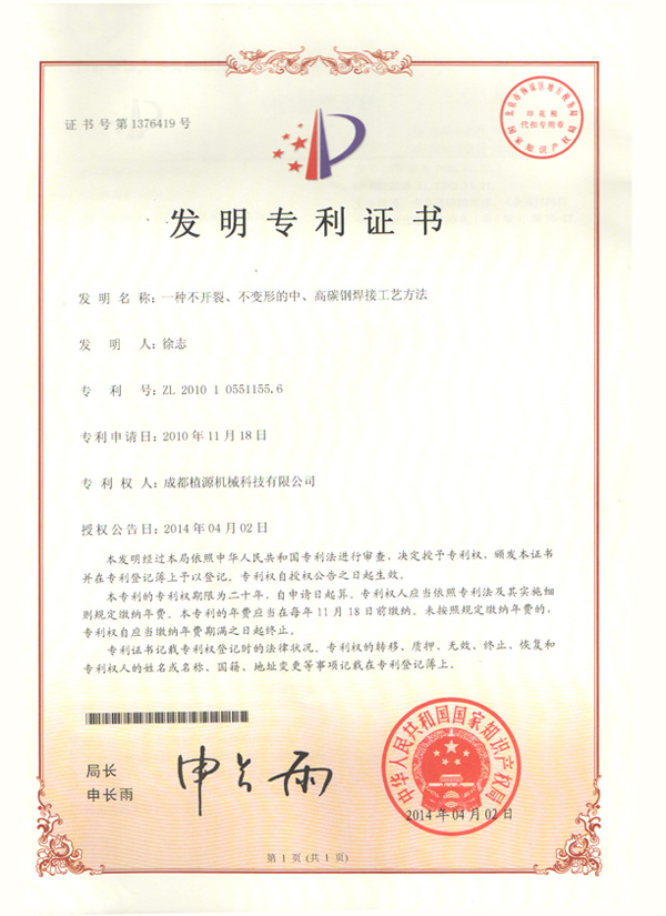 一種不開(kāi)裂、不變形的中、高碳鋼焊接工藝方法獲得國家發(fā)明專(zhuān)利