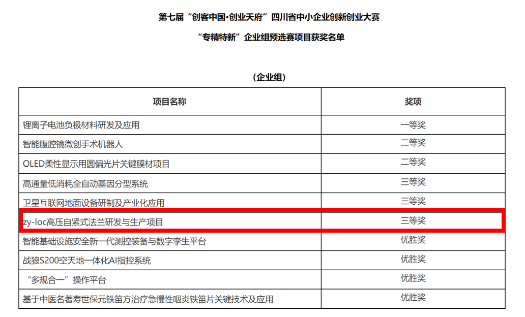 其中,成都植源機械科技有限公司(以下簡(jiǎn)稱(chēng)“植源公司”)參賽的《zy-loc高壓自緊式法蘭研發(fā)與生產(chǎn)項目》榮獲大賽三等獎。