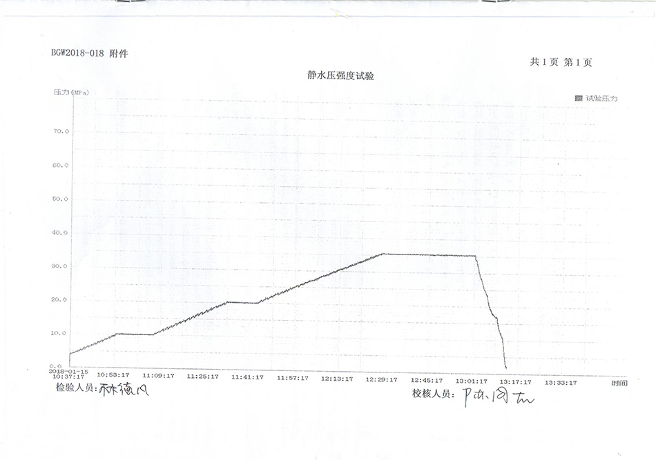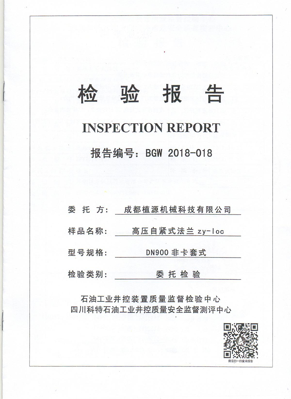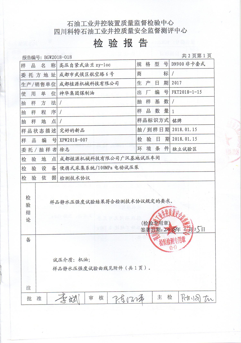 2018年1月15日,受成都植源機械科技有限公司委托,“井控中心”對DN900非卡套式高壓自緊式法蘭ZY-LOC,進(jìn)行了專(zhuān)業(yè)檢測,檢驗要求為:壓力35MPa(設計壓力20MPa),穩壓30分鐘。從升壓開(kāi)始至10MPa,穩壓10分鐘,再次升壓至20MPa,穩壓10分鐘,最后升壓至35MPa,穩壓30分鐘,整個(gè)檢驗過(guò)程受檢產(chǎn)品紋絲不漏,“井控中心”給出結論:無(wú)可見(jiàn)滲漏,壓降0MPa,到現場(chǎng)進(jìn)行產(chǎn)品檢驗的專(zhuān)家,也被監控傳感器反饋至電腦上的數據所折服,專(zhuān)家們說(shuō),這么大的口徑,這么高的壓力,0.3MPa的壓降在國內都屬于非常高的標準了,但是ZY-LOC居然做到了0壓降,不可思議!這么先進(jìn)的產(chǎn)品應該得到國家、各行業(yè)的重視,并大力推廣應用。